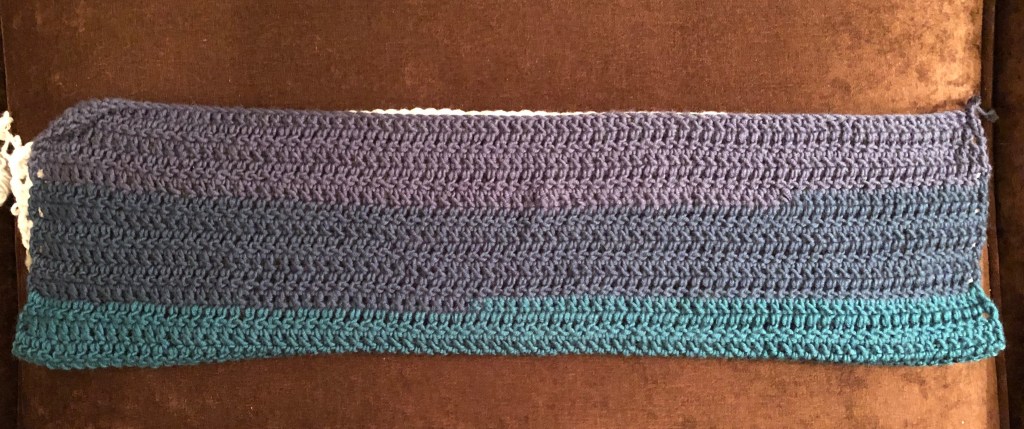 Finish last row of color E leaving enough yarn of color D to sew the sides together (about 2 feet of yarn)