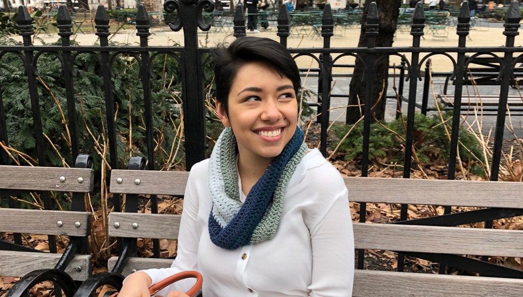 This cowl has a very simple construction, but you don’t need to crochet in the round. After a few tests, I decided it was better for the stripes to be horizontal, and for that it’s much easier to simply build a rectangle, then fold it in half and sew it together to form a tube. This tube twisted once and later sewn together.
