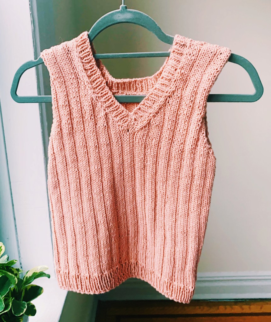 Inspired by the cherry blossoms down my street in Astoria, with their pink flowers that only last a week, this is a sleeveless top, that can also be worn as a vest, and if knitted with cotton yarn, it’s a great spring and summer garment.