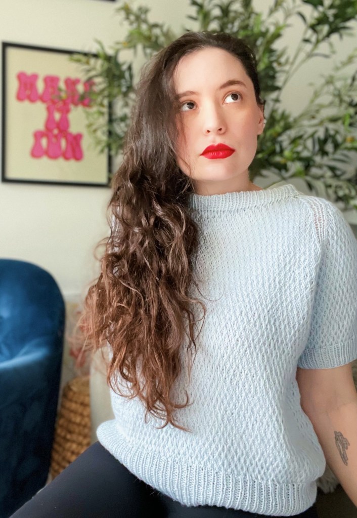 It’s been a while since I’ve released a pattern so I’m really excited about this one. I’ve been working on it for a while and have had my testers also working hard so I could release it in multiple sizes. This top is knit bottom up, but it’s pretty easy to customize the length. It has short sleeves, which are knit separately and then joined to the body, then it finishes up with raglan decreases and a folded neck. It features a slip stitch pattern repeat that gives it texture.
